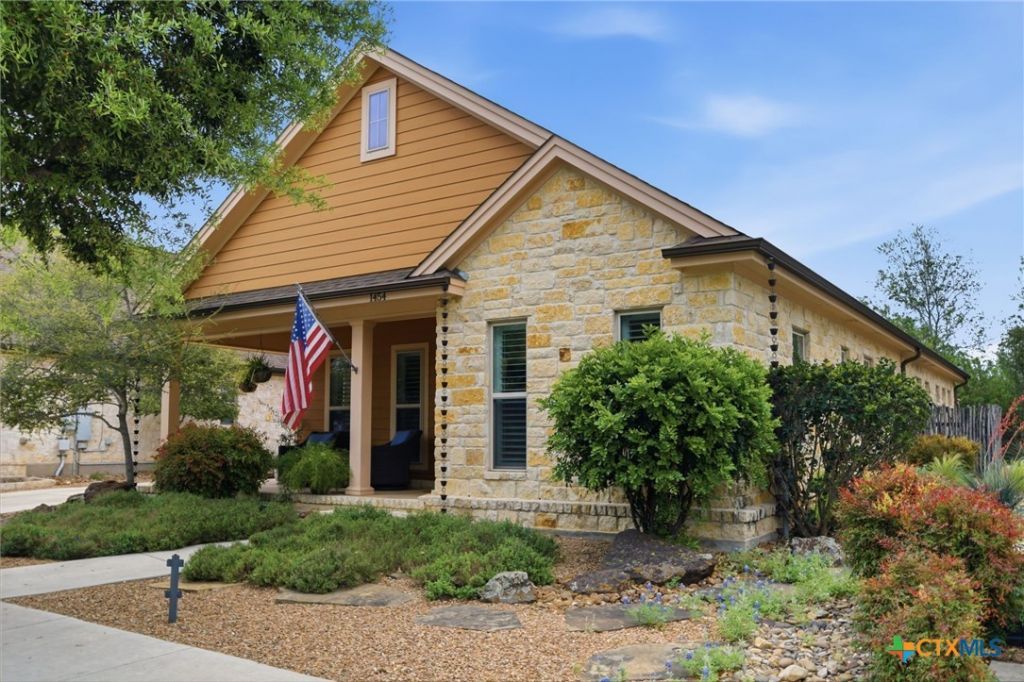 Welcome to Your Custom Hill Country Sanctuary. Live the Gruene lifestyle in this meticulously maintained, 1,547-sq-ft retreat. Every inch of this home reflects a commitment to quality, featuring elegant ceramic wood-look tile and classic plantation shutters on every window for a seamless, high-end aesthetic. In the heart of the home¦A stunning double-sided stone fireplace serves as the centerpiece, creating a warm transition between the living and dining areas. The kitchen is a powerhouse, boasting a granite island with a gas cooktop, built-in high-capacity refrigerator and freezer, a dedicated wine fridge, and a large walk-in pantry. The Primary Retreat is bathed in ample natural light, the master suite features extensive custom shelving in the bedroom and walk-in closet. Enjoy your morning coffee with direct access to the backyard patio right from your room. Flexible living with the second bedroom which is currently utilized as a professional office, featuring a custom Murphy bed that instantly transforms the space for overnight guests. Relax on the classic wrap-around porch to greet the morning walkers, or host sunset gatherings at the dedicated outdoor kitchen. Best of all, you are just a short golf cart ride from historic Gruene Hall and boutique dining. This property offers the perfect blend of quiet community feel and vibrant Hill Country culture.