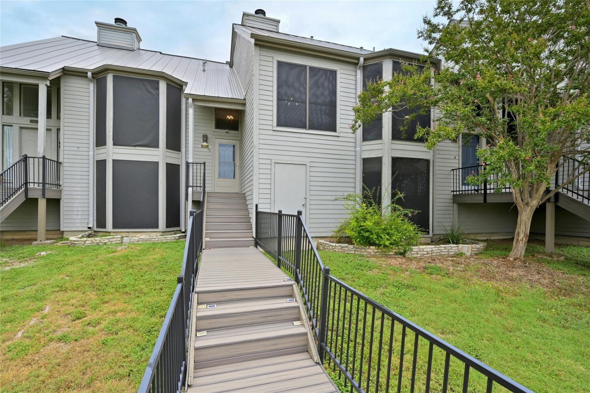 Amazing opportunity to purchase a larger unit under 300k!! Move right in and enjoy a low-maintenance lifestyle! Beautiful, nicely landscaped condo in the heart of Lakeway with tennis courts in your backyard. Located on the hillside away from Lakeway Blvd which offers peace and serenity. 3 bedroom/ 3 bath unit filled with natural light, floor to ceiling windows on main floor and in the main bedroom. Numerous upgrades throughout include granite counters in kitchen, updated/remodeled bathrooms, continuous wood tile flooring with handsome herringbone pattern throughout. The main suite boasts a large sitting area. Free-flowing living/dining rooms with floor to ceiling stone, wood burning fireplace and built-in cabinets, All three bedrooms have incredible closet space. Very functional floor plan with accommodations for most every family. Nearby amenities include multiple golf courses, Lakeway swim center, hike and bike trails, parks, activity center, Lake Travis Library. Close to grocery stores, shopping, restaurants, Scott and White Hospital, The Hill Country Galleria, and beautiful Lake Travis. With membership, The Hills Country Club offers dining, tennis, swimming, fitness, pickleball, and social activities.