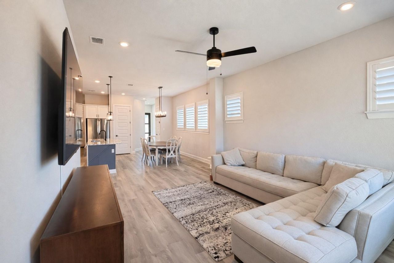 This thoughtfully designed one story home, built in 2022, blends modern style with everyday comfort in a well planned Georgetown community. Natural light pours through oversized windows, highlighting the expansive floorplan, luxury vinyl flooring, and designer selected finishes that give the home a clean, sleek feel from the moment you step inside.The open concept kitchen, dining, and living area truly sits at the heart of the home, making it easy to entertain or simply enjoy daily life. A large kitchen island anchors the space, surrounded by quartz countertops, stainless steel appliances, brushed nickel hardware, and an abundance of cabinetry. Every detail was selected with both function and style in mind.With three bedrooms and two bathrooms, the layout offers flexibility to fit your lifestyle. One secondary bedroom easily adapts as a study, home office, creative space, or gaming room. The primary suite is tucked toward the back of the home, creating a private and spacious retreat. The spa inspired bathroom features double vanities, a large walk in shower, and beautifully executed modern tile work.A generous laundry room with counters and cabinets adds convenience, while the two car garage provides ample storage. Out back, the home backs to open land and features an eight foot privacy fence, offering a peaceful setting with added separation from neighbors.Designed with efficiency in mind, the home holds a 2019 Platinum Environments for Living rating and a HERS Index of 58. The welcoming neighborhood offers sidewalks, preserved oak trees, underground utilities, and easy access to Berry Springs Park and Preserve. Commuters will appreciate quick routes to TX 195 and IH 35.