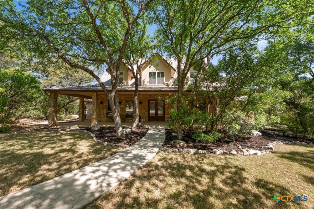 Tucked inside the gated community of Riverforest and set on 2 wooded acres, this custom-built home offers privacy, space, and intentional design just minutes from Gruene Historic District and the best of New Braunfels. A grand living space welcomes you with soaring ceilings, abundant natural light, and a floor-to-ceiling stone fireplace, creating a warm yet striking focal point. With over 4,400 square feet, the home features two living areas, three bedrooms, three and a half bathrooms, and a robust dedicated office with custom built-ins. Upstairs bedrooms each include their own private bathrooms, offering comfort and privacy for guests or family. The owner's suite is a true retreat, complete with a private sitting area, fireplace, outdoor access, and a light-filled bathroom featuring a soaking tub, walk-through shower, dual vanities, and generous closet space. The extended suite addition adds flexibility with its own fireplace, workspace, and secure safe room. The home is thoughtfully positioned around an expansive back patio and deck, designed to capture morning light while remaining shaded and enjoyable in the evenings. The wooded acreage has been left natural, with a landscaped walking path and tucked-away sitting areas that create a peaceful, private setting. Storage is abundant throughout, including oversized closets, attic access in multiple rooms, and an expansive storage area above the three-and-a-half-car garage. Originally built by the current owner after years of military service, this home was designed as a place to settle, unwind, and enjoy-offering a rare combination of space, comfort, and tranquility.