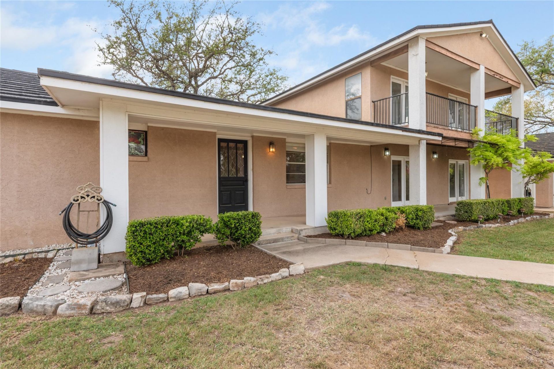 Do you want to live by the lake without the lakefront cost? This gorgeous one-of-a-kind home offers beautiful Texas Hill Country views and is located just a block from Lake Travis. Featuring TWO spacious primary suites, its ideal for multi-generational living or hosting guests in comfort. The home includes a new, energy-efficient roof installed in 2024 with a lifetime warranty, two water heaters replaced in 2022, and a septic system modification completed in 2023?providing peace of mind for years to come. Enjoy stunning sunsets from the upstairs balcony or relax on the expansive covered front porch. Outdoor living shines with multiple backyard patios and plenty of space to explore and walk your land. If storage and functionality are a priority, this property delivers. It features a 3-car garage, workshop, pole barn, carport, and well house?offering endless possibilities for hobbies, equipment, and more. Come see this beauty today! You don't want to miss it.